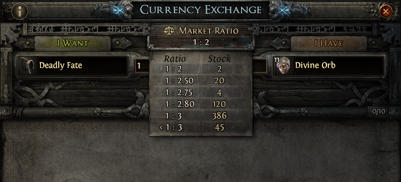 " Yeah that's normal, it just means the price you are asking for is very different from the exchange rate on the market. You can still place the order but it probably wont be sold. It's actually a lot cheaper. Right now people are selling 1 of those for 2 divines on Standard. If you somehow sold one for more than the exchange rate that would be pretty crazy. |